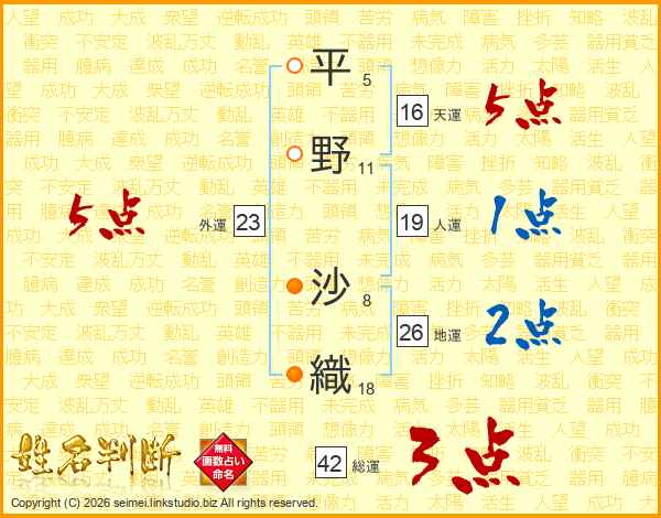 平野沙織 女性 の姓名判断 診断結果 名前の字画数で運勢を占う 無料姓名判断サイト いい名前ねっと